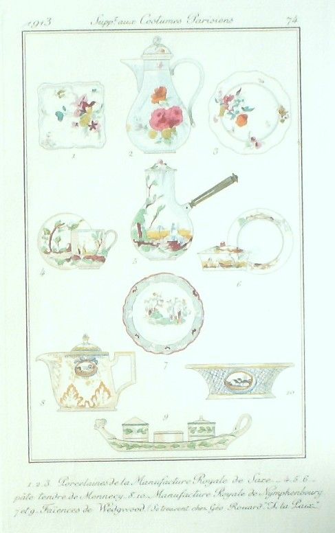 Eau forte authentique coloriee au pochoir rehaussee a la main, sur papier velin verge de Hollande filigrane : edition du journal des dames et des modes costumes parisiens fonde en 1797 par Jean-Baptiste Selleque, et repris en 1801 par Pierre de La Mesangere : Ces toilettes et coiffes representees dressent un panel pointu du costume feminin sous le Directoire, le Consulat et l'Empire ainsi que des costumes masculins. format 120 x 220 . (tirage 1250 exemplaires numerotes) dessinateurs illustrant l'ensemble de ces oeuvres(Barbier George, Berty B, Bureau Louis, Pecoud Andre, Wegener Gerda, Baskt Leon, Brunelleschi Umberto, Damy Robert, Souef J.Renee, Rouard geo, Smith Ismael, Loeze, Gaudray d'Anjou, Metzanov Aris, Sesboue Suzanne, Lemaire Germaine, Taquoy Maurice, Simeon Fernand, Carus Arlette, Gose Javier, Drian Adrien Etienne, Lhuer Victor, Vallee Armand, Fournier Henri, Boutet de Monvel Bernard, Bussy, Broch Jan van, Vever, Legran Pierre, Franc-Nohain Madeleine (mfn)...Lorenzi Fabius, Pichenot Robert, Broders Roger, Honore H, Stefan Andre, Lemain Germaine ) Modele : Porcelaines de la Manufacture Royale de Saxe faiences de Wedgwood