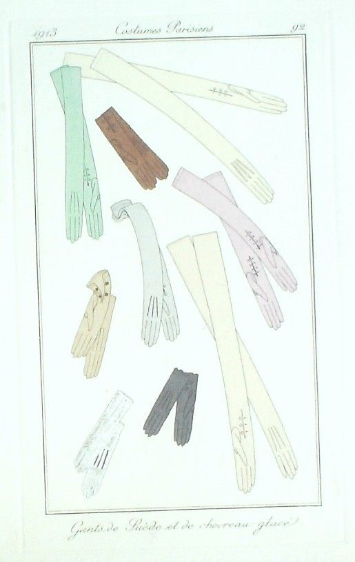 Eau forte authentique coloriee au pochoir rehaussee a la main, sur papier velin verge de Hollande filigrane : edition du journal des dames et des modes costumes parisiens fonde en 1797 par Jean-Baptiste Selleque, et repris en 1801 par Pierre de La Mesangere : Ces toilettes et coiffes representees dressent un panel pointu du costume feminin sous le Directoire, le Consulat et l'Empire ainsi que des costumes masculins. format 120 x 220 . (tirage 1250 exemplaires numerotes) dessinateurs illustrant l'ensemble de ces oeuvres(Barbier George, Berty B, Bureau Louis, Pecoud Andre, Wegener Gerda, Baskt Leon, Brunelleschi Umberto, Damy Robert, Souef J.Renee, Rouard geo, Smith Ismael, Loeze, Gaudray d'Anjou, Metzanov Aris, Sesboue Suzanne, Lemaire Germaine, Taquoy Maurice, Simeon Fernand, Carus Arlette, Gose Javier, Drian Adrien Etienne, Lhuer Victor, Vallee Armand, Fournier Henri, Boutet de Monvel Bernard, Bussy, Broch Jan van, Vever, Legran Pierre, Franc-Nohain Madeleine (mfn)...Lorenzi Fabius, Pichenot Robert, Broders Roger, Honore H, Stefan Andre, Lemain Germaine ) Modele : Gants de Suede et de chevreau glace