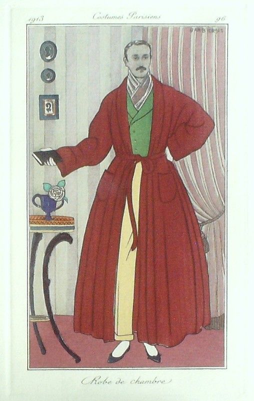 Eau forte authentique coloriee au pochoir rehaussee a la main, sur papier velin verge de Hollande filigrane : edition du journal des dames et des modes costumes parisiens fonde en 1797 par Jean-Baptiste Selleque, et repris en 1801 par Pierre de La Mesangere : Ces toilettes et coiffes representees dressent un panel pointu du costume feminin sous le Directoire, le Consulat et l'Empire ainsi que des costumes masculins. format 120 x 220 . (tirage 1250 exemplaires numerotes) dessinateurs illustrant l'ensemble de ces oeuvres(Barbier George, Berty B, Bureau Louis, Pecoud Andre, Wegener Gerda, Baskt Leon, Brunelleschi Umberto, Damy Robert, Souef J.Renee, Rouard geo, Smith Ismael, Loeze, Gaudray d'Anjou, Metzanov Aris, Sesboue Suzanne, Lemaire Germaine, Taquoy Maurice, Simeon Fernand, Carus Arlette, Gose Javier, Drian Adrien Etienne, Lhuer Victor, Vallee Armand, Fournier Henri, Boutet de Monvel Bernard, Bussy, Broch Jan van, Vever, Legran Pierre, Franc-Nohain Madeleine (mfn)...Lorenzi Fabius, Pichenot Robert, Broders Roger, Honore H, Stefan Andre, Lemain Germaine ) Modele : Robe de chambre