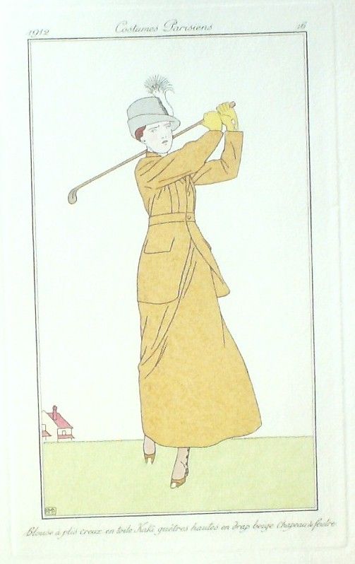 Eau forte authentique coloriee au pochoir rehaussee a la main, sur papier velin verge de Hollande filigrane : edition du journal des dames et des modes costumes parisiens fonde en 1797 par Jean-Baptiste Selleque, et repris en 1801 par Pierre de La Mesangere : Ces toilettes et coiffes representees dressent un panel pointu du costume feminin sous le Directoire, le Consulat et l'Empire ainsi que des costumes masculins. format 120 x 220 . (tirage 1250 exemplaires numerotes) dessinateurs illustrant l'ensemble de ces oeuvres(Barbier George, Berty B, Bureau Louis, Pecoud Andre, Wegener Gerda, Baskt Leon, Brunelleschi Umberto, Damy Robert, Souef J.Renee, Rouard geo, Smith Ismael, Loeze, Gaudray d'Anjou, Metzanov Aris, Sesboue Suzanne, Lemaire Germaine, Taquoy Maurice, Simeon Fernand, Carus Arlette, Gose Javier, Drian Adrien Etienne, Lhuer Victor, Vallee Armand, Fournier Henri, Boutet de Monvel Bernard, Bussy, Broch Jan van, Vever, Legran Pierre, Franc-Nohain Madeleine (mfn)...Lorenzi Fabius, Pichenot Robert, Broders Roger, Honore H, Stefan Andre, Lemain Germaine ) Modele : Blouse a plis creux en toile kaki, guetres hautes en drap beige chapeaux a feutreÂ