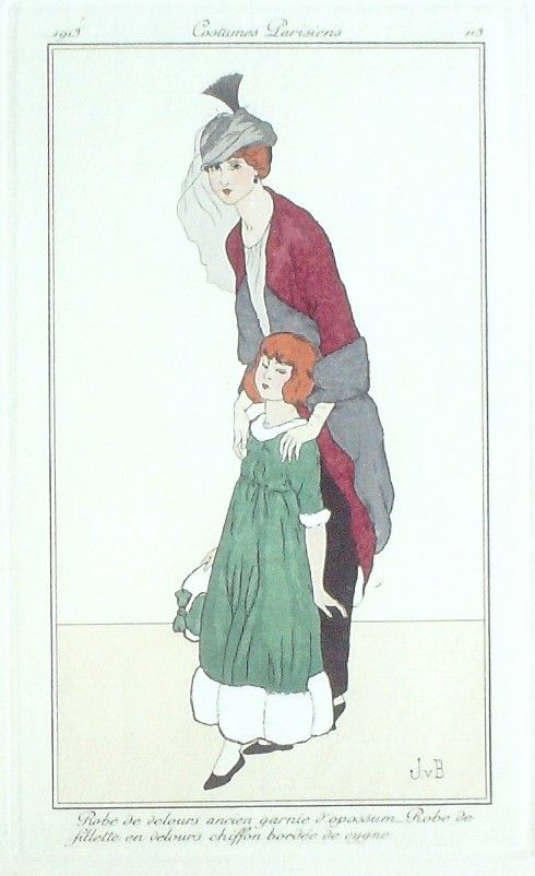 Eau forte authentique coloriee au pochoir rehaussee a la main, sur papier velin verge de Hollande filigrane : edition du journal des dames et des modes costumes parisiens fonde en 1797 par Jean-Baptiste Selleque, et repris en 1801 par Pierre de La Mesangere : Ces toilettes et coiffes representees dressent un panel pointu du costume feminin sous le Directoire, le Consulat et l'Empire ainsi que des costumes masculins. format 120 x 220 . (tirage 1250 exemplaires numerotes) dessinateurs illustrant l'ensemble de ces oeuvres(Barbier George, Berty B, Bureau Louis, Pecoud Andre, Wegener Gerda, Baskt Leon, Brunelleschi Umberto, Damy Robert, Souef J.Renee, Rouard geo, Smith Ismael, Loeze, Gaudray d'Anjou, Metzanov Aris, Sesboue Suzanne, Lemaire Germaine, Taquoy Maurice, Simeon Fernand, Carus Arlette, Gose Javier, Drian Adrien Etienne, Lhuer Victor, Vallee Armand, Fournier Henri, Boutet de Monvel Bernard, Bussy, Broch Jan van, Vever, Legran Pierre, Franc-Nohain Madeleine (mfn)...Lorenzi Fabius, Pichenot Robert, Broders Roger, Honore H, Stefan Andre, Lemain Germaine ) Modele : Robe de velours garnie d'opossum, robe de fillette en velours chiffon bordee de cygne