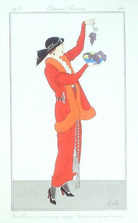 Eau forte authentique coloriee au pochoir rehaussee a la main, sur papier velin verge de Hollande filigrane : edition du journal des dames et des modes costumes parisiens fonde en 1797 par Jean-Baptiste Selleque, et repris en 1801 par Pierre de La Mesangere : Ces toilettes et coiffes representees dressent un panel pointu du costume feminin sous le Directoire, le Consulat et l'Empire ainsi que des costumes masculins. format 120 x 220 . (tirage 1250 exemplaires numerotes) dessinateurs illustrant l'ensemble de ces oeuvres(Barbier George, Berty B, Bureau Louis, Pecoud Andre, Wegener Gerda, Baskt Leon, Brunelleschi Umberto, Damy Robert, Souef J.Renee, Rouard geo, Smith Ismael, Loeze, Gaudray d'Anjou, Metzanov Aris, Sesboue Suzanne, Lemaire Germaine, Taquoy Maurice, Simeon Fernand, Carus Arlette, Gose Javier, Drian Adrien Etienne, Lhuer Victor, Vallee Armand, Fournier Henri, Boutet de Monvel Bernard, Bussy, Broch Jan van, Vever, Legran Pierre, Franc-Nohain Madeleine (mfn)...Lorenzi Fabius, Pichenot Robert, Broders Roger, Honore H, Stefan Andre, Lemain Germaine ) Modele : Tailleur de Juvetyn rouge borde de renard rouge