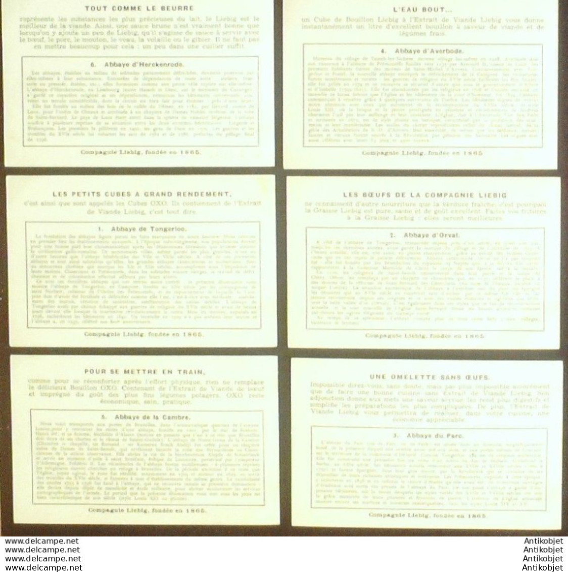 6 Vignettes publicitaires dite chromo des potages Liebig au format 107 x 70 periode de 1893 a 1943 Serie complete
