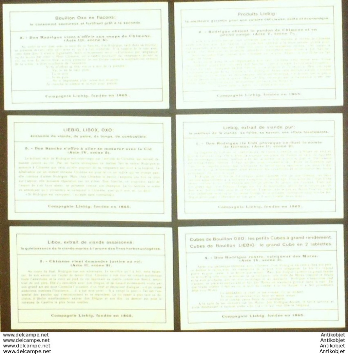 6 Vignettes publicitaires dite chromo des potages Liebig au format 107 x 70 periode de 1893 a 1943 Serie complete