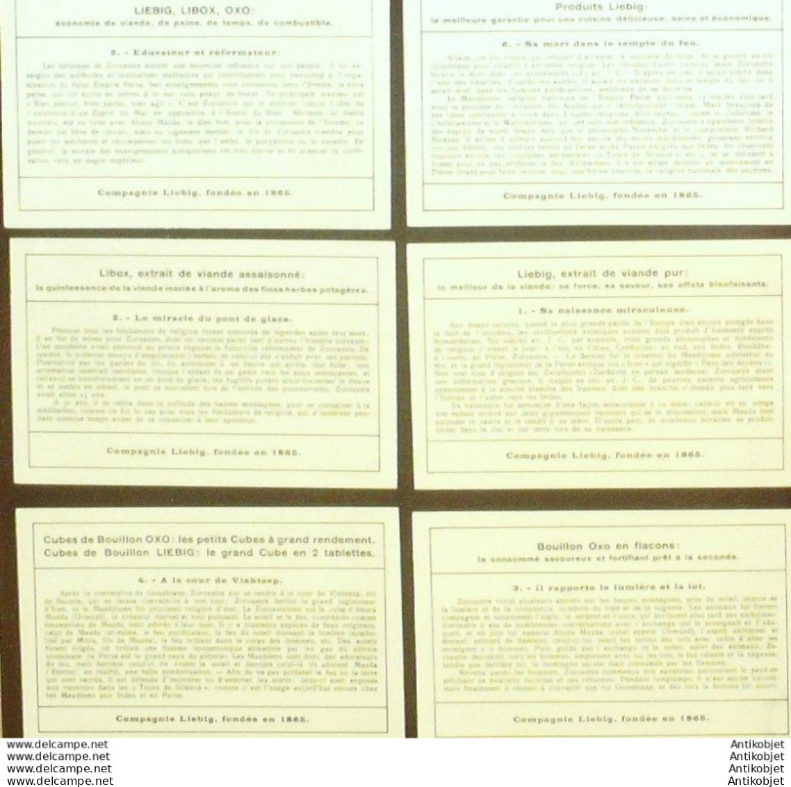 6 Vignettes publicitaires dite chromo des potages Liebig au format 107 x 70 periode de 1893 a 1943 Serie complete