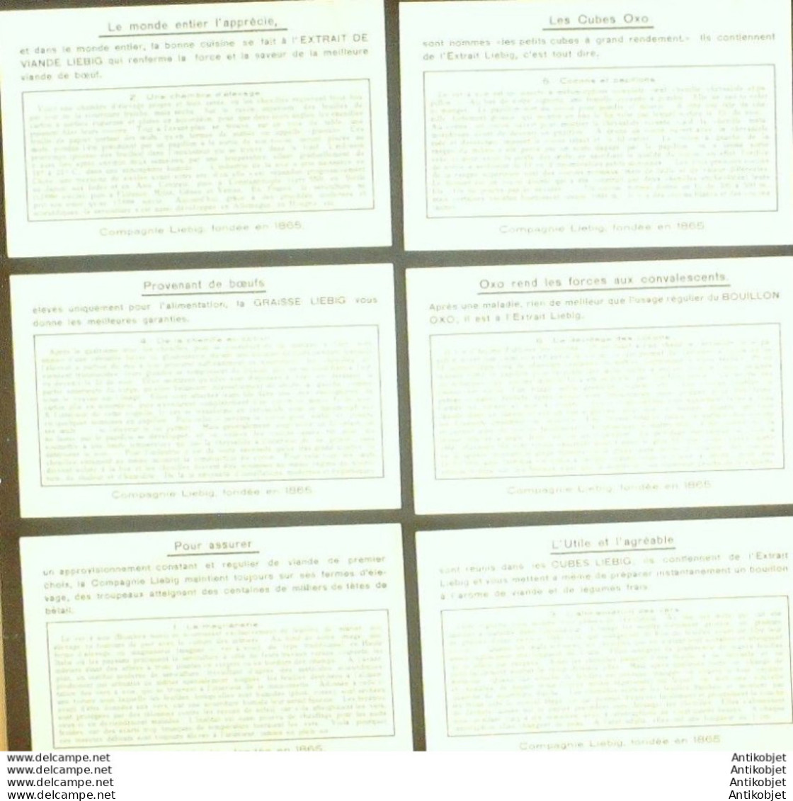 6 Vignettes publicitaires dite chromo des potages Liebig au format 107 x 70 periode de 1893 a 1943 Serie complete