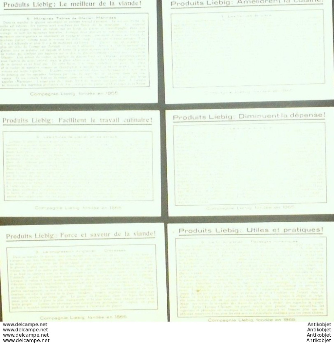 6 Vignettes publicitaires dite chromo des potages Liebig au format 107 x 70 periode de 1893 a 1943 Serie complete