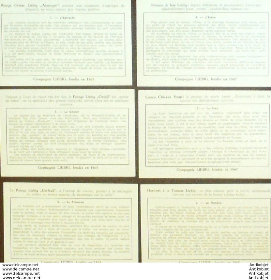 6 Vignettes publicitaires dite chromo des potages Liebig au format 107 x 70 periode de 1893 a 1943 Serie complete