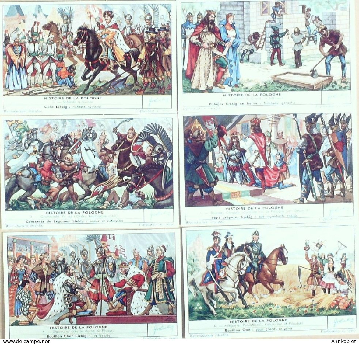 6 Vignettes publicitaires dite chromo des potages Liebig au format 107 x 70 periode de 1893 a 1943 Serie complete