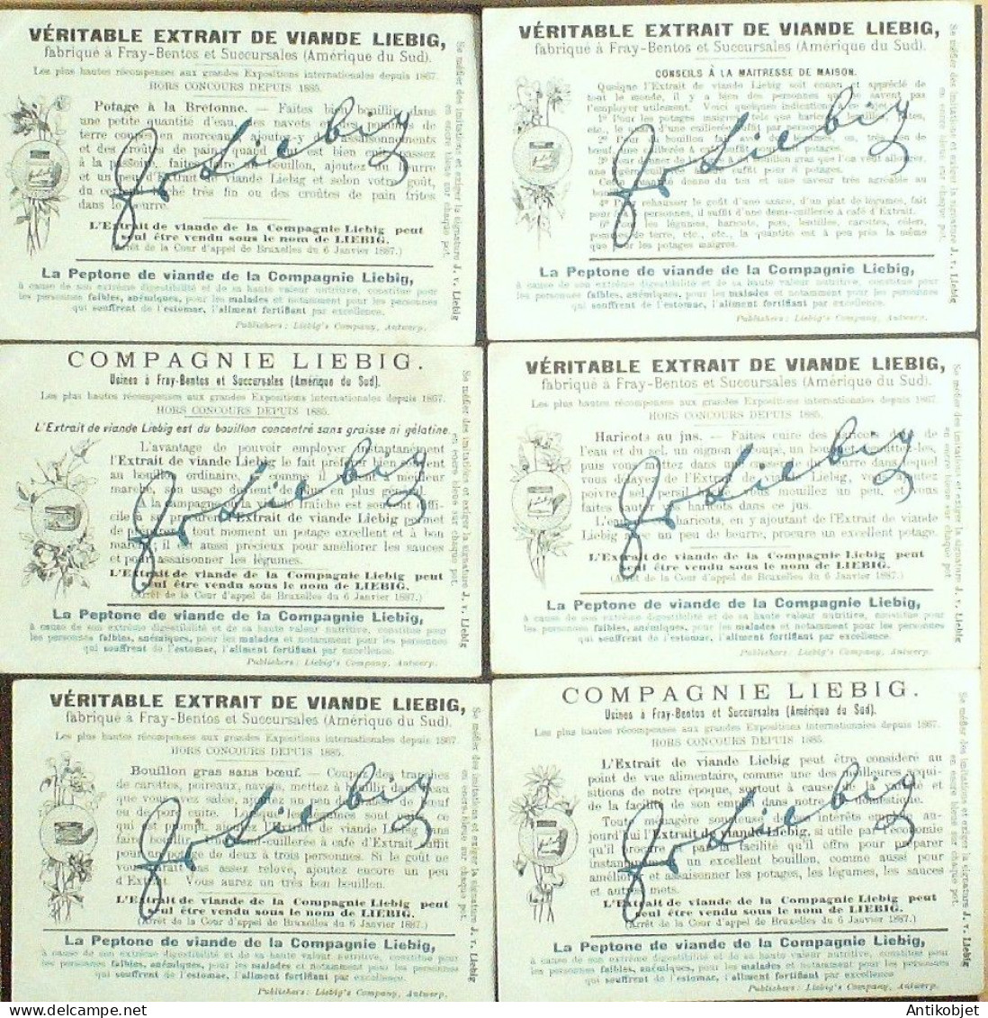 6 Vignettes publicitaires dite chromo des potages Liebig au format 107 x 70 periode de 1893 a 1943 Serie complete