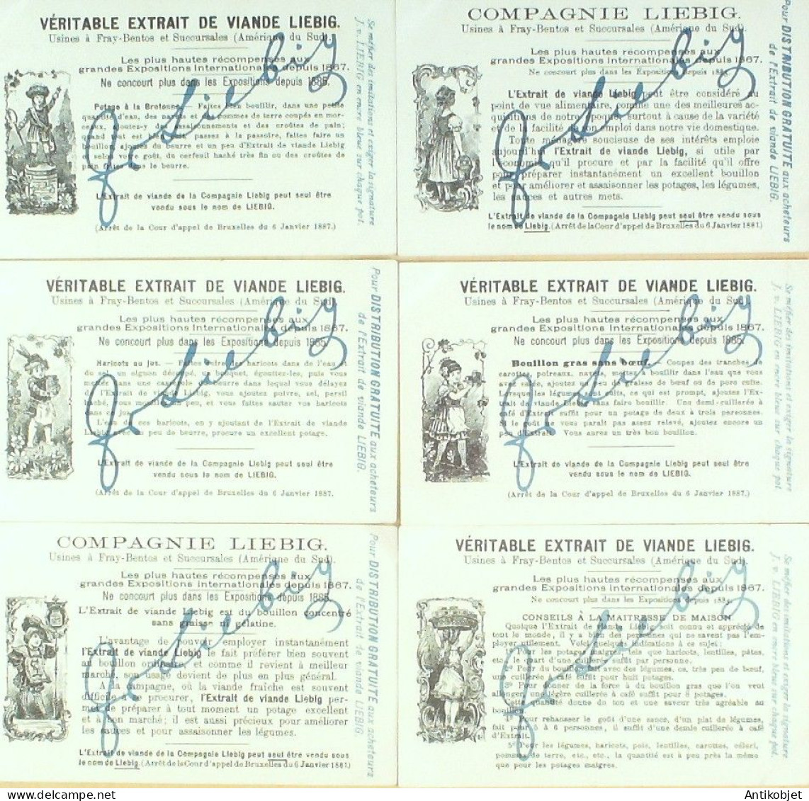 6 Vignettes publicitaires dite chromo des potages Liebig au format 107 x 70 periode de 1893 a 1943 Serie complete