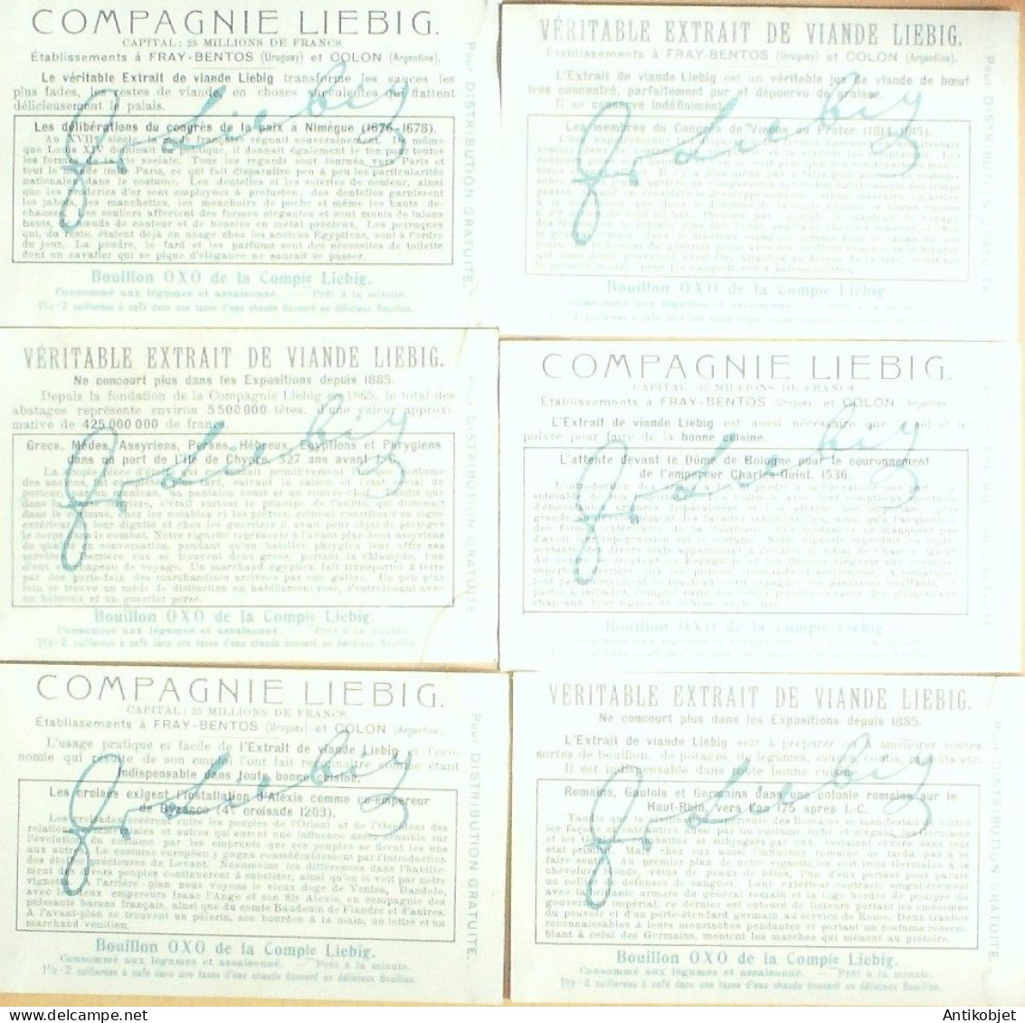 6 Vignettes publicitaires dite chromo des potages Liebig au format 107 x 70 periode de 1893 a 1943 Serie complete