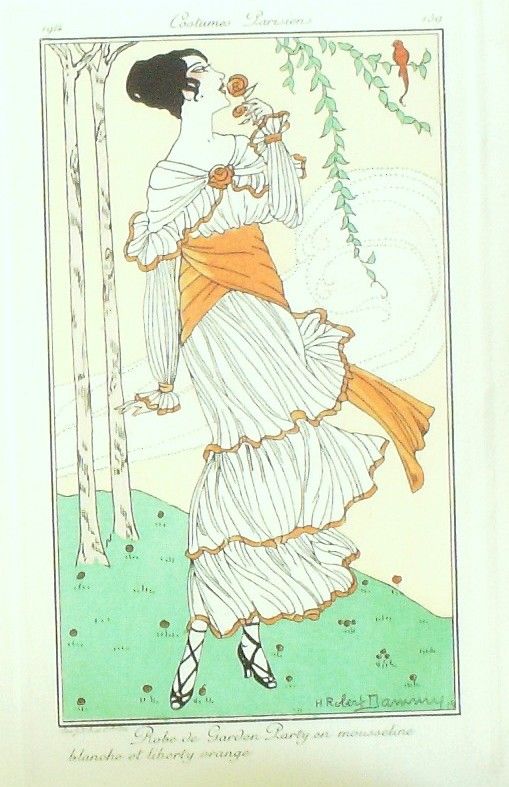 Eau forte authentique coloriee au pochoir rehaussee a la main, sur papier velin verge de Hollande filigrane : edition du journal des dames et des modes costumes parisiens fonde en 1797 par Jean-Baptiste Selleque, et repris en 1801 par Pierre de La Mesangere : Ces toilettes et coiffes representees dressent un panel pointu du costume feminin sous le Directoire, le Consulat et l'Empire ainsi que des costumes masculins. format 120 x 220 . (tirage 1250 exemplaires numerotes) dessinateurs illustrant l'ensemble de ces oeuvres(Barbier George, Berty B, Bureau Louis, Pecoud Andre, Wegener Gerda, Baskt Leon, Brunelleschi Umberto, Damy Robert, Souef J.Renee, Rouard geo, Smith Ismael, Loeze, Gaudray d'Anjou, Metzanov Aris, Sesboue Suzanne, Lemaire Germaine, Taquoy Maurice, Simeon Fernand, Carus Arlette, Gose Javier, Drian Adrien Etienne, Lhuer Victor, Vallee Armand, Fournier Henri, Boutet de Monvel Bernard, Bussy, Broch Jan van, Vever, Legran Pierre, Franc-Nohain Madeleine (mfn)...Lorenzi Fabius, Pichenot Robert, Broders Roger, Honore H, Stefan Andre, Lemain Germaine ) Modele : Robe de Garden Party en mousseline blanche et liberty orange