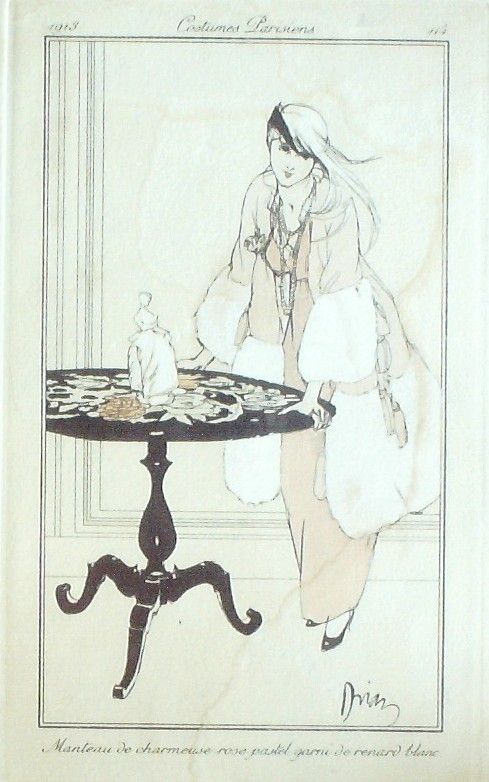 Eau forte authentique coloriee au pochoir rehaussee a la main, sur papier velin verge de Hollande filigrane : edition du journal des dames et des modes costumes parisiens fonde en 1797 par Jean-Baptiste Selleque, et repris en 1801 par Pierre de La Mesangere : Ces toilettes et coiffes representees dressent un panel pointu du costume feminin sous le Directoire, le Consulat et l'Empire ainsi que des costumes masculins. format 120 x 220 . (tirage 1250 exemplaires numerotes) dessinateurs illustrant l'ensemble de ces oeuvres(Barbier George, Berty B, Bureau Louis, Pecoud Andre, Wegener Gerda, Baskt Leon, Brunelleschi Umberto, Damy Robert, Souef J.Renee, Rouard geo, Smith Ismael, Loeze, Gaudray d'Anjou, Metzanov Aris, Sesboue Suzanne, Lemaire Germaine, Taquoy Maurice, Simeon Fernand, Carus Arlette, Gose Javier, Drian Adrien Etienne, Lhuer Victor, Vallee Armand, Fournier Henri, Boutet de Monvel Bernard, Bussy, Broch Jan van, Vever, Legran Pierre, Franc-Nohain Madeleine (mfn)...Lorenzi Fabius, Pichenot Robert, Broders Roger, Honore H, Stefan Andre, Lemain Germaine ) Modele : Manteau de charmeuse rose pastel garni de renard