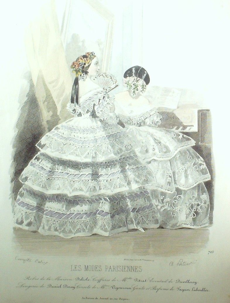 Gravure Les Modes Parisiennes 1854 # 725 Robes Maison Delisle