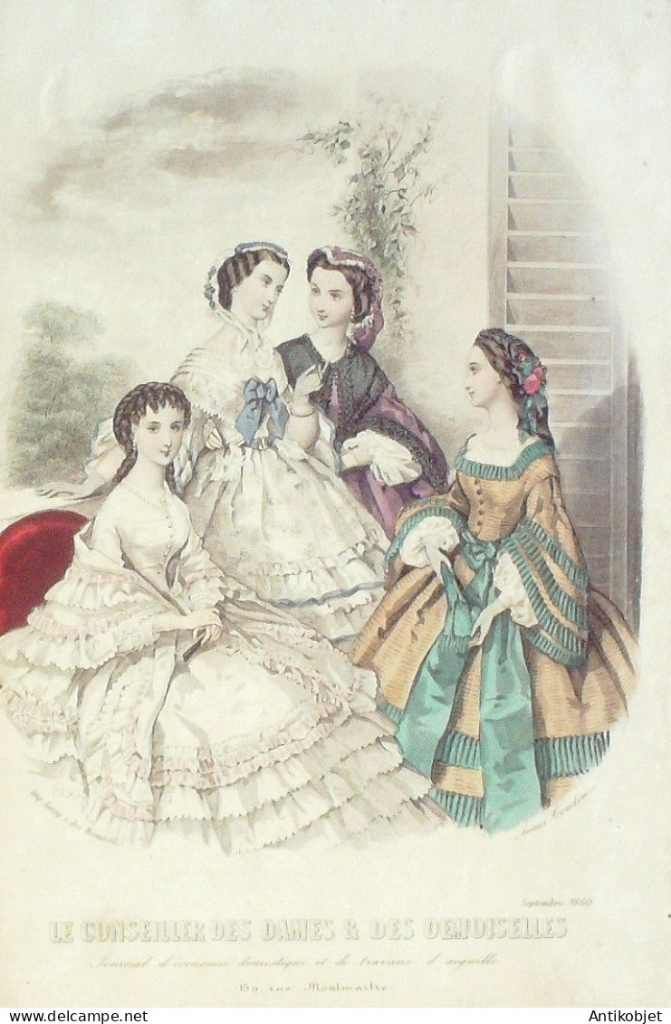 Gravure Mode Conseiller des Dames 1860 # 9 (aquarellee Old Fashion plate)