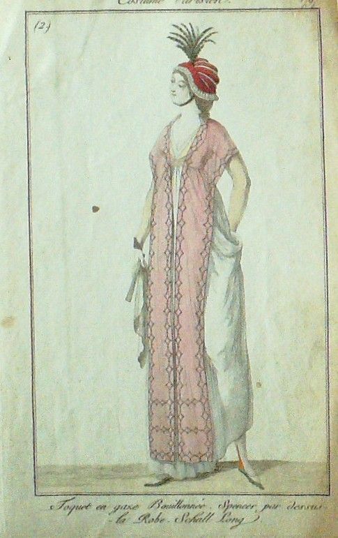 Eau forte authentique aquarellee rehaussee a la main, sur papier velin, issue des editions du journal des dames et des modes fonde en 1797 par Jean-Baptiste Selleque, et repris en 1801 par Pierre de La Mesangere : " Ces toilettes, coiffes & lingeries ainsi representees, dressent un panel pointu du costume feminin sous le Directoire, le Consulat et l'Empire ainsi que des costumes masculins. format 120 x 200 Gravure : Toquet en gaze bouillonnee.Spencer par dessus la Robe Schall long.