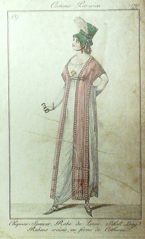 Eau forte authentique aquarellee rehaussee a la main, sur papier velin, issue des editions du journal des dames et des modes fonde en 1797 par Jean-Baptiste Selleque, et repris en 1801 par Pierre de La Mesangere : " Ces toilettes, coiffes & lingeries ainsi representees, dressent un panel pointu du costume feminin sous le Directoire, le Consulat et l'Empire ainsi que des costumes masculins. format 120 x 200 Gravure : Robe de Linon Schall rubans croises en forme de Cathurne chapeau Spencer