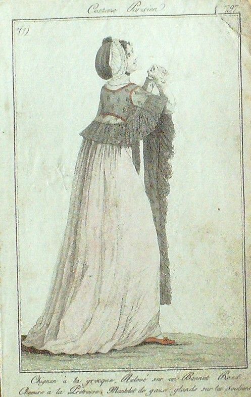 Eau forte authentique aquarellee rehaussee a la main, sur papier velin, issue des edition du journal des dames et des modes fonde en 1797 par Jean-Baptiste Selleque, et repris en 1801 par Pierre de La Mesangere : " Ces toilettes et coiffes representees dressent un panel pointu du costume feminin sous le Directoire, le Consulat et l'Empire ainsi que des costumes masculins. format 120 x 200 Gravure : Chignon a la grecque. Releve sur un bonnet rond. Chemise a la Praªtresse. Mantelet de gaze, glands sur les souliers
