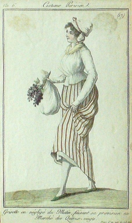Eau forte authentique aquarellee rehaussee a la main, sur papier velin, issue des edition du journal des dames et des modes fonde en 1797 par Jean-Baptiste Selleque, et repris en 1801 par Pierre de La Mesangere : " Ces toilettes et coiffes representees dressent un panel pointu du costume feminin sous le Directoire, le Consulat et l'Empire ainsi que des costumes masculins. format 120 x 200 Gravure : Griselle en neglige du matin faisant sa provisiona‚ au marchea‚ des Quinze-vingts