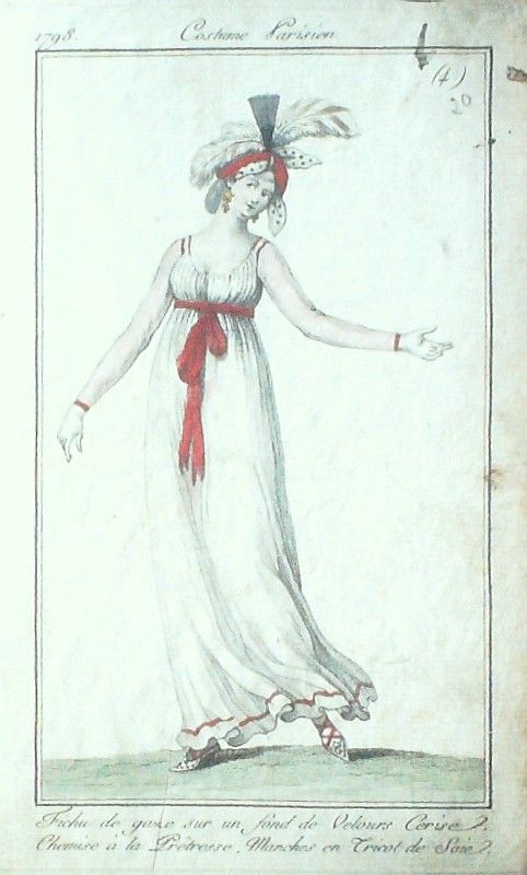 Eau forte authentique aquarellee rehaussee a la main, sur papier velin, issue des edition du journal des dames et des modes fonde en 1797 par Jean-Baptiste Selleque, et repris en 1801 par Pierre de La Mesangere : " Ces toilettes et coiffes representees dressent un panel pointu du costume feminin sous le Directoire, le Consulat et l'Empire ainsi que des costumes masculins. format 120 x 200 Gravure : Fichu de gaze sur fond de velours Cerise chemise a la Praªtresse manches en tricot de soie