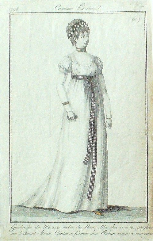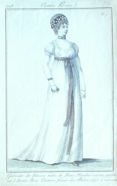Eau forte authentique aquarellee rehaussee a la main, sur papier velin, issue des edition du journal des dames et des modes fonde en 1797 par Jean-Baptiste Selleque, et repris en 1801 par Pierre de La Mesangere : " Ces toilettes et coiffes representees dressent un panel pointu du costume feminin sous le Directoire, le Consulat et l'Empire ainsi que des costumes masculins. format 120 x 200 Gravure : Guirlande de mousse maªlee de fleurs. Manches courtes gonflees sur l'avant-bras. Ceinture formee d'un ruban raye a carreaux.