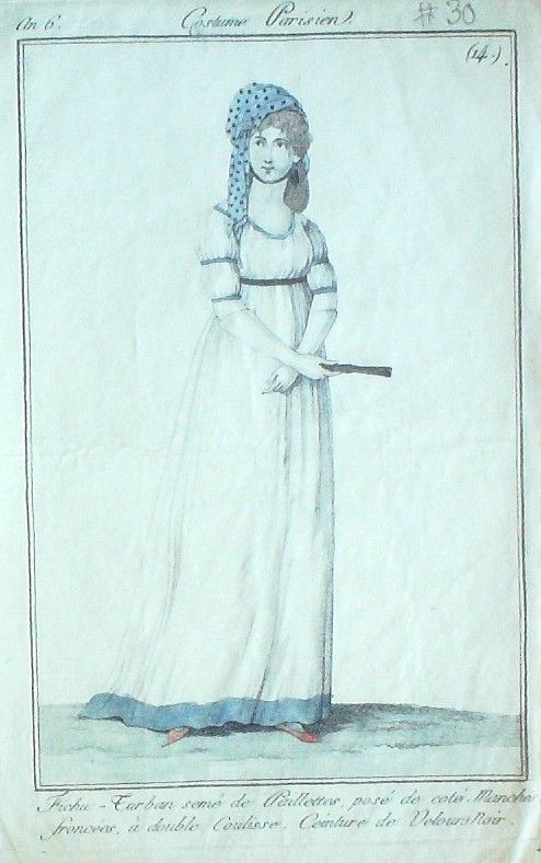Eau forte authentique aquarellee rehaussee a la main, sur papier velin, issue des edition du journal des dames et des modes fonde en 1797 par Jean-Baptiste Selleque, et repris en 1801 par Pierre de La Mesangere : " Ces toilettes et coiffes representees dressent un panel pointu du costume feminin sous le Directoire, le Consulat et l'Empire ainsi que des costumes masculins. format 120 x 200 Gravure : Fichu. Turban seme de paillettes, pose de ca´te. a‚ Manches froncees, a double coulisse. Ceinture de velours noir