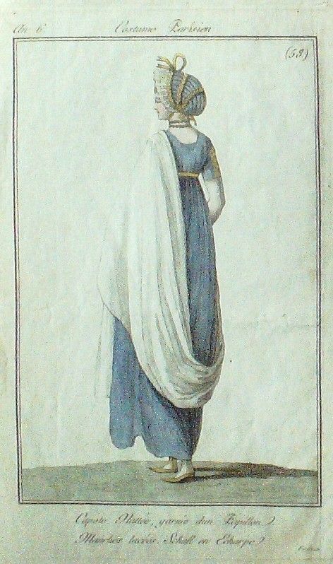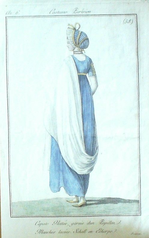 Eau forte authentique aquarellee rehaussee a la main, sur papier velin, issue des edition du journal des dames et des modes fonde en 1797 par Jean-Baptiste Selleque, et repris en 1801 par Pierre de La Mesangere : " Ces toilettes et coiffes representees dressent un panel pointu du costume feminin sous le Directoire, le Consulat et l'Empire ainsi que des costumes masculins. format 120 x 200 Gravure : Capote mattee, garnie d'un papillon. a‚ Manches lacees. Schall en echarpe