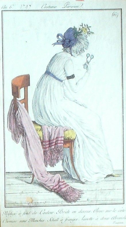 Eau forte authentique aquarellee rehaussee a la main, sur papier velin, issue des edition du journal des dames et des modes fonde en 1797 par Jean-Baptiste Selleque, et repris en 1801 par Pierre de La Mesangere : " Ces toilettes et coiffes representees dressent un panel pointu du costume feminin sous le Directoire, le Consulat et l'Empire ainsi que des costumes masculins. format 120 x 200 Gravure : Neglige a fond de couleur. Bride en dessus. Rose sur le ca´te. Chemise sans manches. Schall a franges. Lunette a deux branches