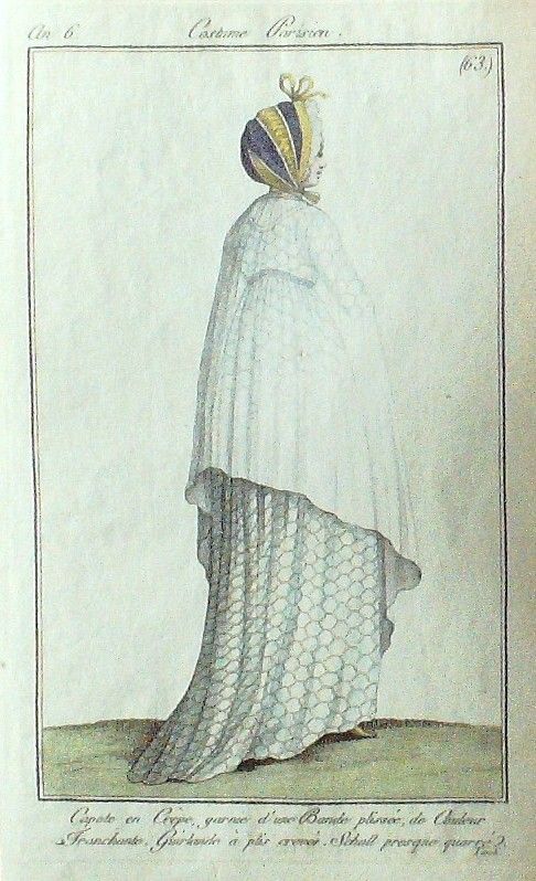 Eau forte authentique aquarellee rehaussee a la main, sur papier velin, issue des edition du journal des dames et des modes fonde en 1797 par Jean-Baptiste Selleque, et repris en 1801 par Pierre de La Mesangere : " Ces toilettes et coiffes representees dressent un panel pointu du costume feminin sous le Directoire, le Consulat et l'Empire ainsi que des costumes masculins. format 120 x 200 Gravure : Capote en craªpe, garnie d'une bande plissee de couleur tranchante, a‚ guirlande a plis creves. Schall presque carre"