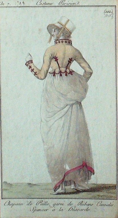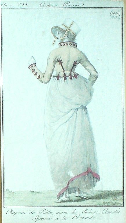 Eau forte authentique aquarellee rehaussee a la main, sur papier velin, issue des edition du journal des dames et des modes fonde en 1797 par Jean-Baptiste Selleque, et repris en 1801 par Pierre de La Mesangere : " Ces toilettes et coiffes representees dressent un panel pointu du costume feminin sous le Directoire, le Consulat et l'Empire ainsi que des costumes masculins. format 120 x 200 Gravure : chapeau de paille garni de rubans canneles Spencer a la hussarde " Ces toilettes et coiffes representees dressent un panel pointu du costume feminin sous le Directoire, le Consulat et l'Empire ainsi que des costumes masculins. format 120 x 200 Gravure : (Thea tre frana§ais de la Republique)
