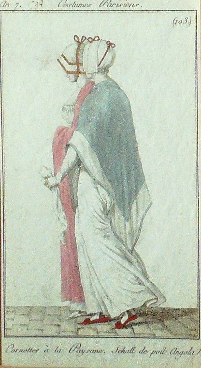 Eau forte authentique aquarellee rehaussee a la main, sur papier velin, issue des edition du journal des dames et des modes fonde en 1797 par Jean-Baptiste Selleque, et repris en 1801 par Pierre de La Mesangere : " Ces toilettes et coiffes representees dressent un panel pointu du costume feminin sous le Directoire, le Consulat et l'Empire ainsi que des costumes masculins. format 120 x 200 Gravure : Cornette a la paysanne Schall de poil Angola