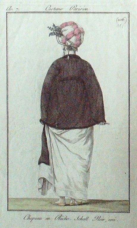 Eau forte authentique aquarellee rehaussee a la main, sur papier velin, issue des edition du journal des dames et des modes fonde en 1797 par Jean-Baptiste Selleque, et repris en 1801 par Pierre de La Mesangere : " Ces toilettes et coiffes representees dressent un panel pointu du costume feminin sous le Directoire, le Consulat et l'Empire ainsi que des costumes masculins. format 120 x 200 Gravure : chapeau en ra»che, Schall noir uni