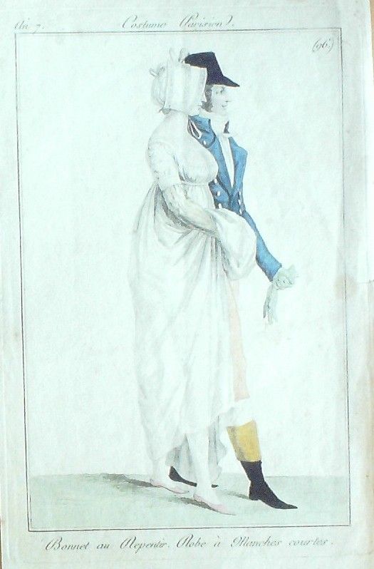 Eau forte authentique aquarellee rehaussee a la main, sur papier velin, issue des edition du journal des dames et des modes fonde en 1797 par Jean-Baptiste Selleque, et repris en 1801 par Pierre de La Mesangere : " Ces toilettes et coiffes representees dressent un panel pointu du costume feminin sous le Directoire, le Consulat et l'Empire ainsi que des costumes masculins. format 120 x 200 Gravure : Bonnet au repentir. Robe a manches courtes" a‚
