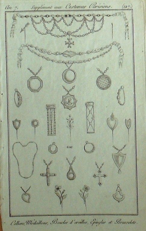 Eau forte authentique aquarellee rehaussee a la main, sur papier velin, issue des edition du journal des dames et des modes fonde en 1797 par Jean-Baptiste Selleque, et repris en 1801 par Pierre de La Mesangere : " Ces toilettes et coiffes representees dressent un panel pointu du costume feminin sous le Directoire, le Consulat et l'Empire ainsi que des costumes masculins. format 120 x 200 Gravure : Colliers medaillons boucles d'oreilles epingles et brasselets