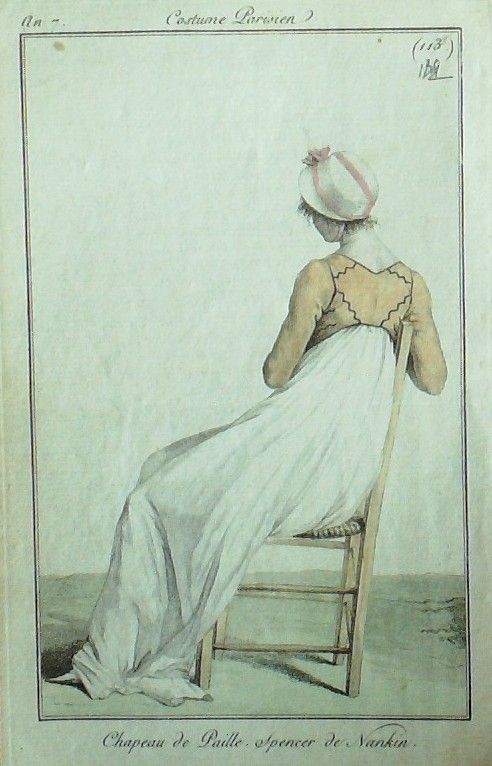 Eau forte authentique aquarellee rehaussee a la main, sur papier velin, issue des edition du journal des dames et des modes fonde en 1797 par Jean-Baptiste Selleque, et repris en 1801 par Pierre de La Mesangere : " Ces toilettes et coiffes representees dressent un panel pointu du costume feminin sous le Directoire, le Consulat et l'Empire ainsi que des costumes masculins. format 120 x 200 Gravure : Spencer de Nankin chapeau de paille