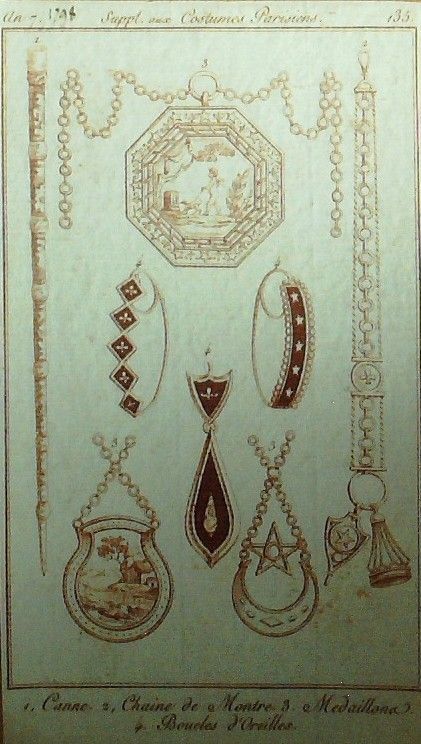 Eau forte authentique aquarellee rehaussee a la main, sur papier velin, issue des edition du journal des dames et des modes fonde en 1797 par Jean-Baptiste Selleque, et repris en 1801 par Pierre de La Mesangere : " Ces toilettes et coiffes representees dressent un panel pointu du costume feminin sous le Directoire, le Consulat et l'Empire ainsi que des costumes masculins. format 120 x 200 Gravure : Canne boucles d'oreilles, medaillons