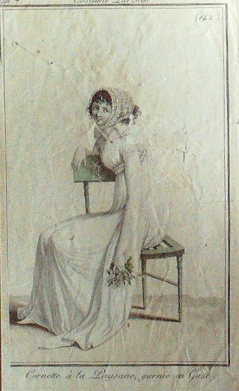 Eau forte authentique aquarellee rehaussee a la main, sur papier velin, issue des edition du journal des dames et des modes fonde en 1797 par Jean-Baptiste Selleque, et repris en 1801 par Pierre de La Mesangere : " Ces toilettes et coiffes representees dressent un panel pointu du costume feminin sous le Directoire, le Consulat et l'Empire ainsi que des costumes masculins. format 120 x 200 Gravure : Cornette a la paysanne garnie en gaze" a‚