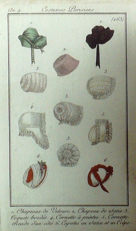 Eau forte authentique aquarellee rehaussee a la main, sur papier velin, issue des edition du journal des dames et des modes fonde en 1797 par Jean-Baptiste Selleque, et repris en 1801 par Pierre de La Mesangere : " Ces toilettes et coiffes representees dressent un panel pointu du costume feminin sous le Directoire, le Consulat et l'Empire ainsi que des costumes masculins. format 120 x 200 Gravure : Chapeaux de velours, toquets brodes, Cornette a pointesCapotes en satin et en craªpe