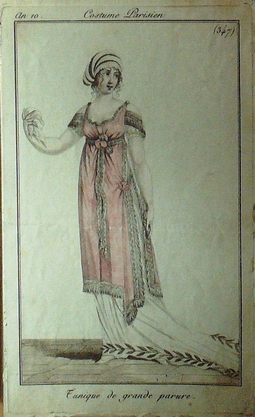 Eau forte authentique aquarellee rehaussee a la main, sur papier velin, issue des edition du journal des dames et des modes fonde en 1797 par Jean-Baptiste Selleque, et repris en 1801 par Pierre de La Mesangere : " Ces toilettes et coiffes representees dressent un panel pointu du costume feminin sous le Directoire, le Consulat et l'Empire ainsi que des costumes masculins. format 120 x 200 Gravure : Tunique a grande parure