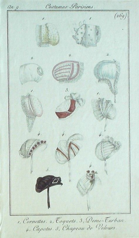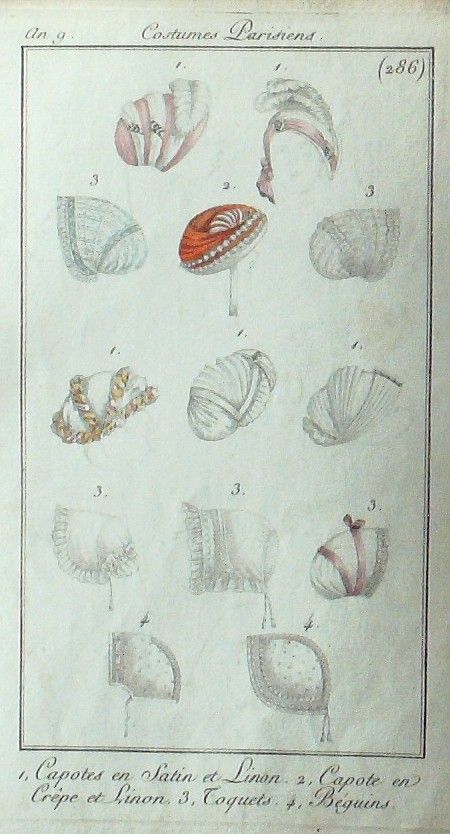Eau forte authentique aquarellee rehaussee a la main, sur papier velin, issue des edition du journal des dames et des modes fonde en 1797 par Jean-Baptiste Selleque, et repris en 1801 par Pierre de La Mesangere : " Ces toilettes et coiffes representees dressent un panel pointu du costume feminin sous le Directoire, le Consulat et l'Empire ainsi que des costumes masculins. format 120 x 200 Gravure : Capotes en satin et Linon, capote en craªpe. Toquets, Beguins