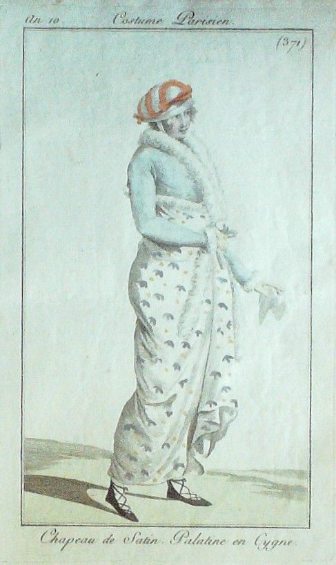 Eau forte authentique aquarellee rehaussee a la main, sur papier velin, issue des edition du journal des dames et des modes fonde en 1797 par Jean-Baptiste Selleque, et repris en 1801 par Pierre de La Mesangere : " Ces toilettes et coiffes representees dressent un panel pointu du costume feminin sous le Directoire, le Consulat et l'Empire ainsi que des costumes masculins. format 120 x 200 Gravure : Chapeau de satin. Palatine en cygne