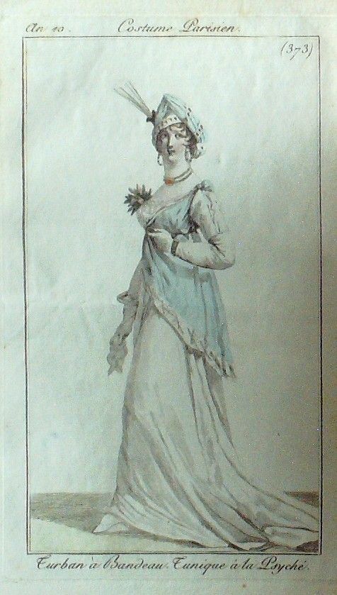 Eau forte authentique aquarellee rehaussee a la main, sur papier velin, issue des edition du journal des dames et des modes fonde en 1797 par Jean-Baptiste Selleque, et repris en 1801 par Pierre de La Mesangere : " Ces toilettes et coiffes representees dressent un panel pointu du costume feminin sous le Directoire, le Consulat et l'Empire ainsi que des costumes masculins. format 120 x 200 Gravure : Turban a bandeau. Tunique a a la Psyche