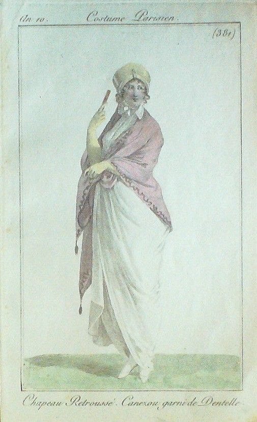 Eau forte authentique aquarellee rehaussee a la main, sur papier velin, issue des edition du journal des dames et des modes fonde en 1797 par Jean-Baptiste Selleque, et repris en 1801 par Pierre de La Mesangere : " Ces toilettes et coiffes representees dressent un panel pointu du costume feminin sous le Directoire, le Consulat et l'Empire ainsi que des costumes masculins. format 120 x 200 Gravure : Chapeau retrousse. canezou garni de dentelle