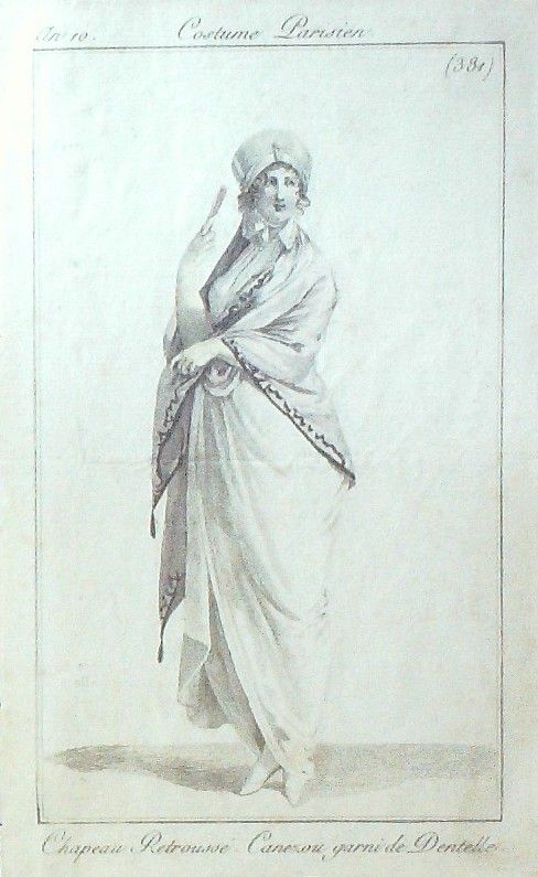 Eau forte authentique aquarellee rehaussee a la main, sur papier velin, issue des edition du journal des dames et des modes fonde en 1797 par Jean-Baptiste Selleque, et repris en 1801 par Pierre de La Mesangere : " Ces toilettes et coiffes representees dressent un panel pointu du costume feminin sous le Directoire, le Consulat et l'Empire ainsi que des costumes masculins. format 120 x 200 Gravure : Chapeau retrousse. canezou garni de dentelle
