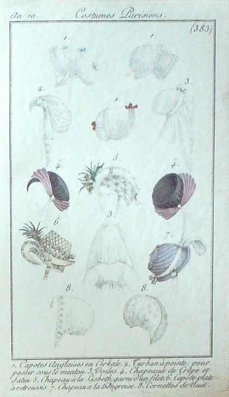 Eau forte authentique aquarellee rehaussee a la main, sur papier velin, issue des edition du journal des dames et des modes fonde en 1797 par Jean-Baptiste Selleque, et repris en 1801 par Pierre de La Mesangere : " Ces toilettes et coiffes representees dressent un panel pointu du costume feminin sous le Directoire, le Consulat et l'Empire ainsi que des costumes masculins. format 120 x 200 Gravure : Capotes anglaises ezn Perkale, Turban, Voiles, Chapeaux de craªpe et de Lisbeth, cornettes de nuit