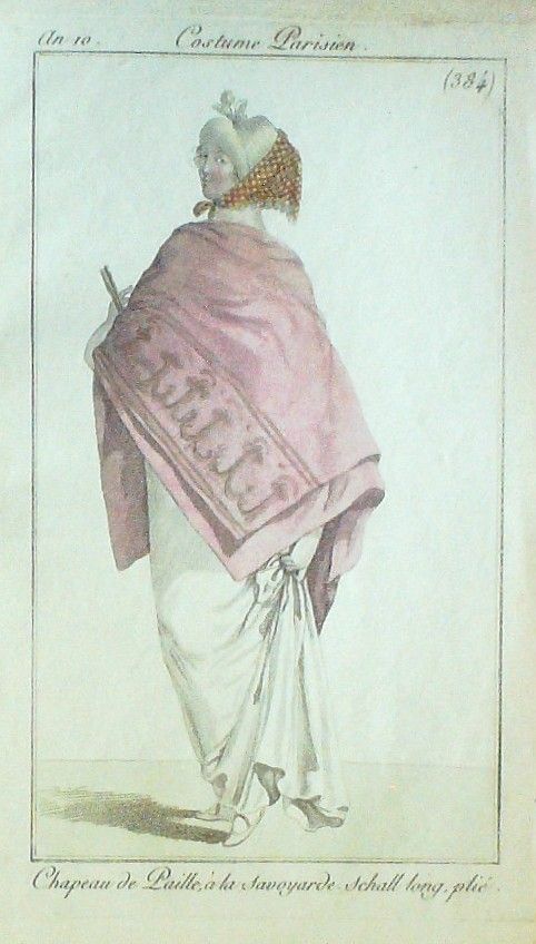 Eau forte authentique aquarellee rehaussee a la main, sur papier velin, issue des edition du journal des dames et des modes fonde en 1797 par Jean-Baptiste Selleque, et repris en 1801 par Pierre de La Mesangere : " Ces toilettes et coiffes representees dressent un panel pointu du costume feminin sous le Directoire, le Consulat et l'Empire ainsi que des costumes masculins. format 120 x 200 Gravure : Chapeau de paille a la savoyarde. Schall long plie