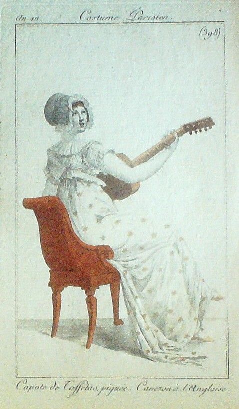 Eau forte authentique aquarellee rehaussee a la main, sur papier velin, issue des edition du journal des dames et des modes fonde en 1797 par Jean-Baptiste Selleque, et repris en 1801 par Pierre de La Mesangere : " Ces toilettes et coiffes representees dressent un panel pointu du costume feminin sous le Directoire, le Consulat et l'Empire ainsi que des costumes masculins. format 120 x 200 Gravure : Capote de taffetas piquee. Canezou a l'Anglaise