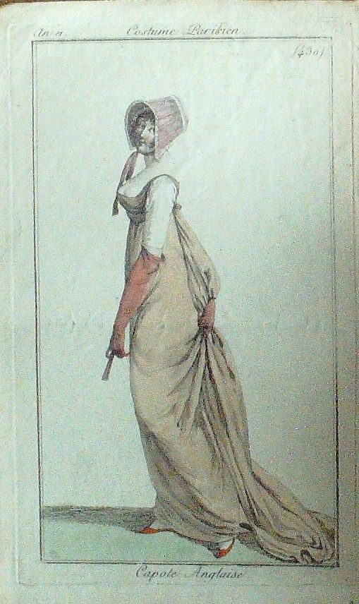 Eau forte authentique aquarellee rehaussee a la main, sur papier velin, issue des edition du journal des dames et des modes fonde en 1797 par Jean-Baptiste Selleque, et repris en 1801 par Pierre de La Mesangere : " Ces toilettes et coiffes representees dressent un panel pointu du costume feminin sous le Directoire, le Consulat et l'Empire ainsi que des costumes masculins. format 120 x 200 Gravure : Capote anglaise