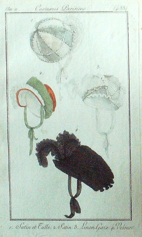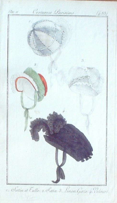 Eau forte authentique aquarellee rehaussee a la main, sur papier velin, issue des edition du journal des dames et des modes fonde en 1797 par Jean-Baptiste Selleque, et repris en 1801 par Pierre de La Mesangere : " Ces toilettes et coiffes representees dressent un panel pointu du costume feminin sous le Directoire, le Consulat et l'Empire ainsi que des costumes masculins. format 120 x 200 Gravure : Satin et Tulle, Linon, gaze, velours